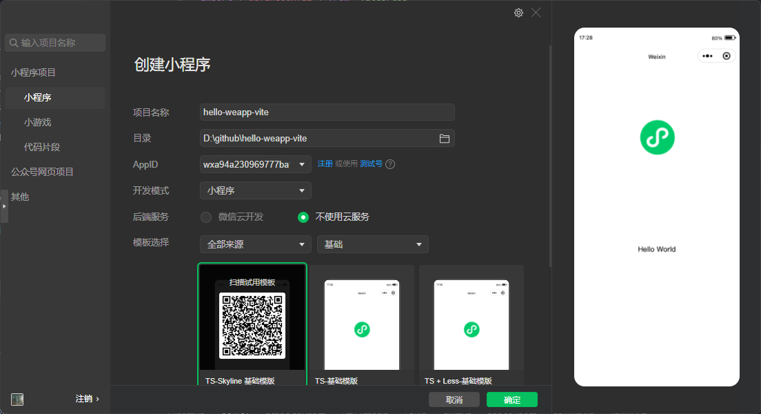 打开微信开发者工具, 点击 + 创建一个项目,依次选择: